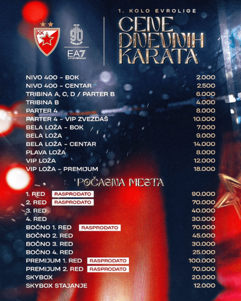 Kako su naveli u Crvenoj zvezdi, pristalice kluba će meč protiv Armanija moći da posmatraju već za 2.000 dinara koliko košta najjeftinija ulaznica za evroligašku premijeru.