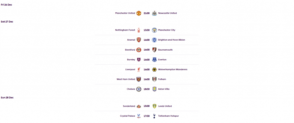 Mančester junajted će dočekati Njukasl u petak od 21.00, dok će se ostali mečevi igrati regularno za vikend 27. i 28. decembra. Ono što može biti uteha za navijače u Engleskoj jeste činjenica da će se za Boksing Dej igrati svi mečevi Čempionšipa, Lige 1 i Lige 2.