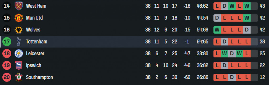 Međutim, aktuelna situacija nije najgore što se ekipi Totenhema može dogoditi. Naime, ukoliko sezonu okončaju na navedenoj 18. poziciji, ekipi sa "Vajt Hart Lejna" preti potpuni kolaps.