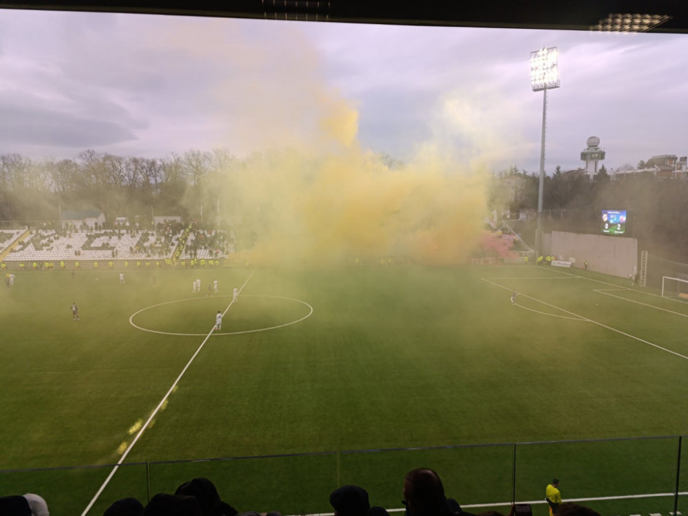 Bakljada gostujućih navijača i vetar koji duva u pravcu terena doveo je do prekida utakmice. Moraće igrači da sačekaju da se rasčisti magla!