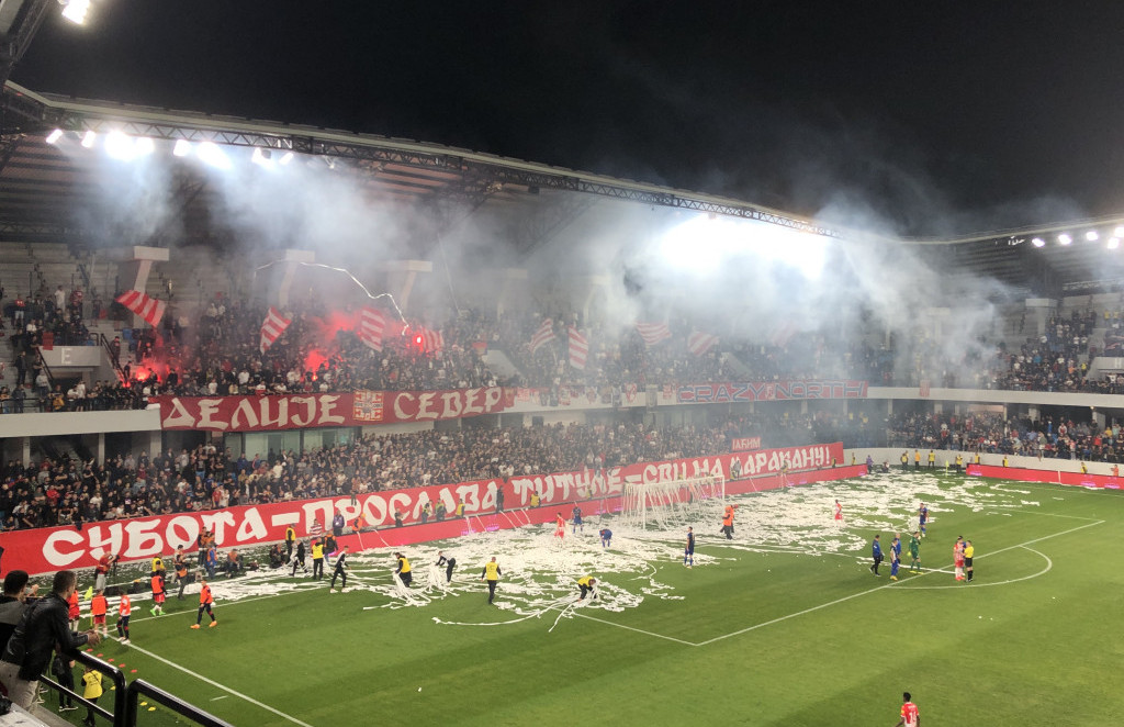 Na samom početku drugog poluvremena igra je prekinuta zbog ubačenih papira od strane navijača Crvene zvezde. Igrači obe ekipe su, uz pomoć redara, zajedničkim snagama očistili kazneni prostor kako bi se meč nastavio. Nije se puno igralo u uvodnih 15 minuta drugog dela utakmice. Pauza je usledila i zbog sudara Carevića i Uroša Spajića. Obojica su krenuli na loptu i medicinske ekipe su im odmah ukazale pomoć, te su ostali na terenu.