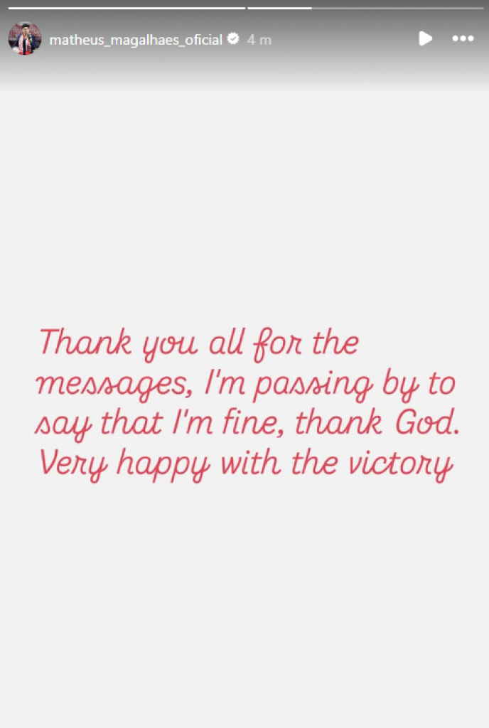 Posle meča, Dejan Stanković je zabrinuo sve na konferenciji rekavši da Mateus "ima momente gde gubi pamćenje". Ipak, Brazilac je rešio da se sam oglasi na društvenim mrežama i otkrije da se oseća dobro.