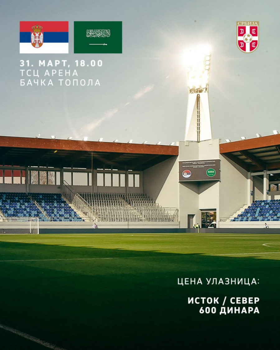Fudbalski savez Srbije odredio je cene ulaznica za prijateljsku utakmicu između A reprezentacija Srbije i Saudijske Arabije, koja će biti odigrana 31. marta na TSC Areni u Bačkoj Topoli, sa početkom u 18 časova.