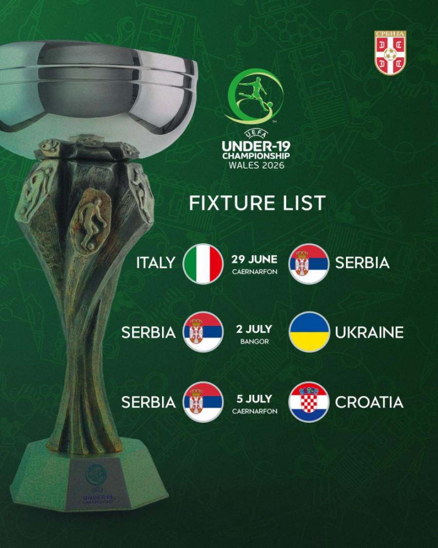 Omladinska (U-19) reprezentacija Srbije danas je saznala rivale na Evropskom prvenstvu u Velsu, koje se održava od 28. juna do 11. jula 2026. godine. Voljom žreba, Srbija se nalazi u grupi B sa selekcijama Hrvatske, Italije i Ukrajine.