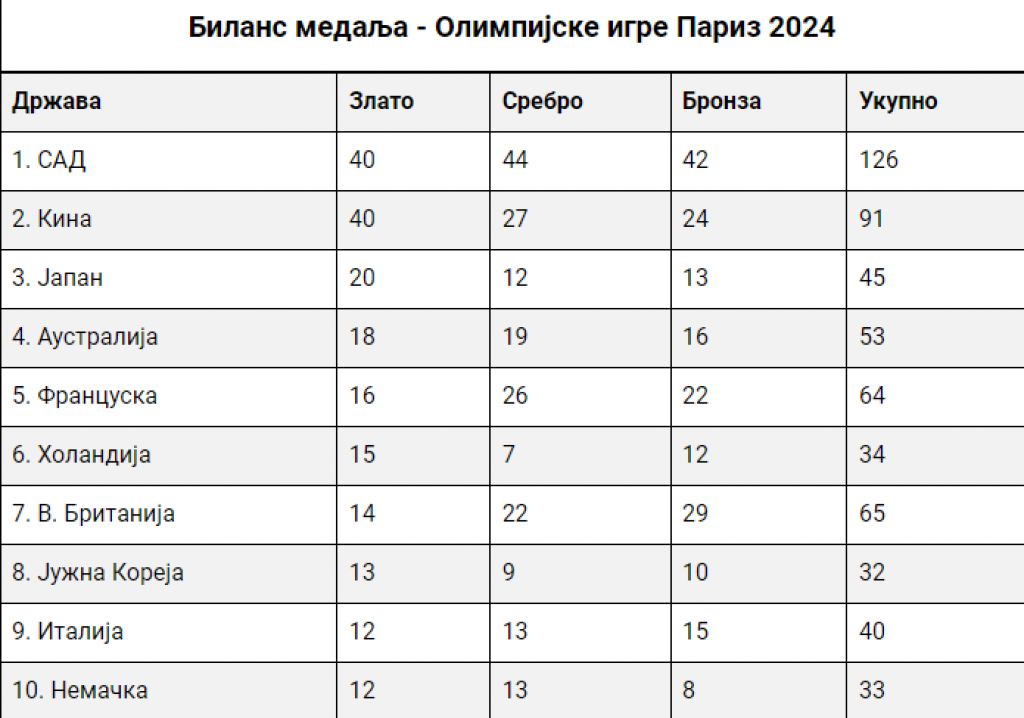 Kada se sve sumira, solidan rezultat našeg olimpijskog tima, koji je po broju zlatnih medalja bio i najbolji u regionu, dok je primat najtrofejnije selekcije ponela Amerika sa 126 odličja, ispred Kine (91), Velike Britanije (65) i Francuske (64), ne račujanući tradicionalno rangiranje po broju osvojenih zlatnih medalja.