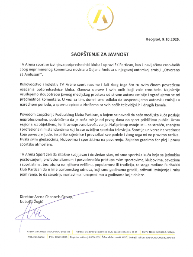 TV Arena Sport želi da istakne svoj jasan i dosledan stav, mi smo sportska kuća koja sa jednakim poštovanjem, profesionalizmom i posvećenošću pristupa svim sportovima, klubovima, savezima i sportistima, bez obzira na njihovu veličinu, popularnost ili tradiciju, te stoga molimo Fudbalski klub Partizan da u ime partnerskog odnosa, koji smo godinama gradili, prihvati izvinjenje i ruku pomirenja, te da saradnju nastavimo i unapredimo u godinama koje dolaze.