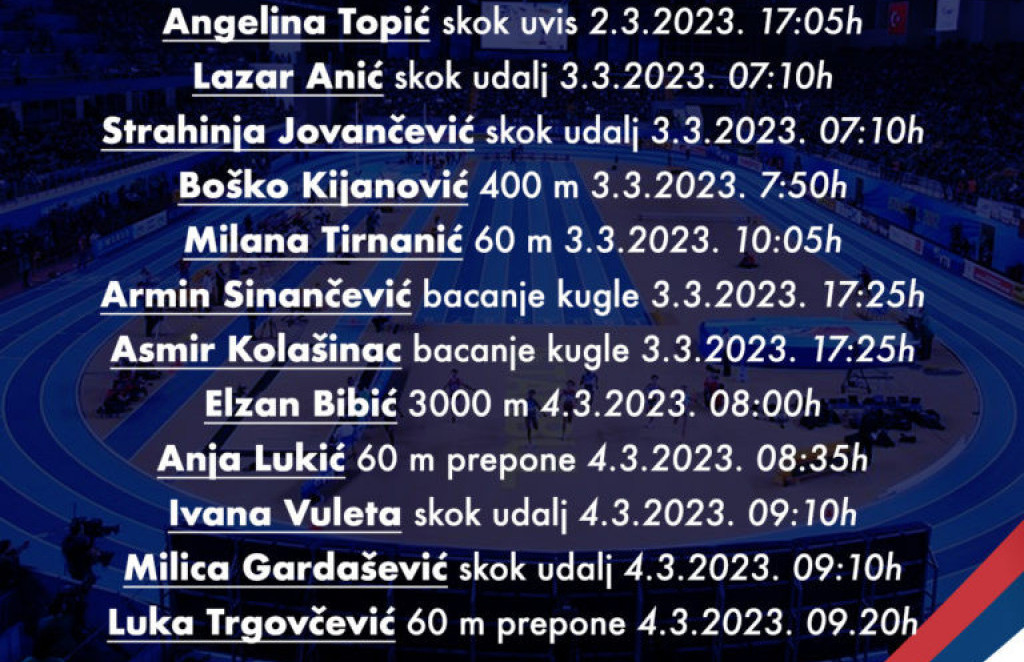 Dvorana "Atakoj arena" u Istanbulu biće od danas do nedelje 5. marta mesto gde će se organizovati Evropsko prvenstvo u atletici, a Srbiju će na ovom takmičenju predstavljati 12 takmičara i to: Ivana Vuleta i Milica Gardašević (skok udalj), Armin Sinančević i Asmir Kolašinac (bacanje kugle), Angelina Topić (skok uvis), Boško Kijanović (400 m), Lazar Anić i Strahinja Jovančević (skok udalj), Elzan Bibić (3000 m), Anja Lukić (60 m prepone), Luka Trgovčević (60 m prepone) i Milana Tirnanić (60 m).