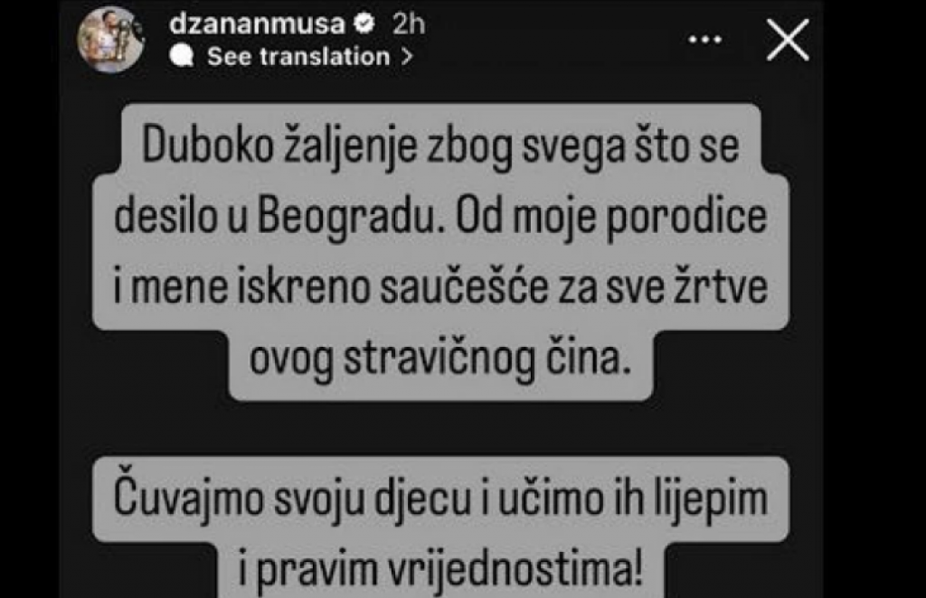 "Duboko žaljenje zbog svega što se desilo u Beogradu. Od moje porodice i mene iskreno saučešće za sve žrtve ovog stravičnog čina. Čuvajmo svoju decu i učimo ih lepim i pravim vrednostima", napisao je danas na svom Instagram profilu član "kraljevskog" kluba iz Bosne i Hercegovine.