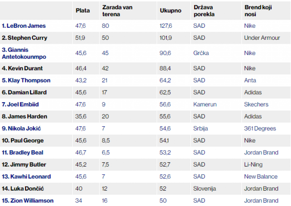 Jedini sportista iz Adria regiona ispred njega je srpski košarkaš Nikola Jokić (32. pozicija), sa ukupnom zaradom od 56,1 milion dolara. Jokić je takođe sarađivao sa kompanijom Nike, a onda je krajem 2023. godine potpisao višegodišnji ugovor sa manje poznatim kineskim proizvođačem patika 361 Degrees. Tako je dobio svoju ličnu seriju patika, što nije postigao sa brendom Nike. Inače, Jokić je bio jedini MVP u poslednjih 16 godina bez sopstvene linije patika.
